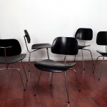 Charles était alors enseignant à l’Académie des Arts de Cranbrook où Ray étudiait la peinture abstraite. Mariés en 1941, leurs premières réalisations sont destinées à l’US Navy. A partir de la technique de modelage thermique du contreplaqué développé par Alvar Aalto, les Eames conçoivent des brancards et attelles pour les blessés. Les besoins de la société d’après-guerre en logement et en mobilier à bas-prix incitent les designers à utiliser de nouveaux matériaux, et les époux Eames reprennent alors le procédé de modelage du contreplaqué pour fabriquer meubles et sièges comme les chaises DCM. Cette technique de moulage à l’origine de leur renommée, nécessitait une compression dans les trois dimensions et garantissait à la fois confort et souplesse. Épouser les formes du corps humain restera l’un des objectifs des Eames tout au long de leur carrière.