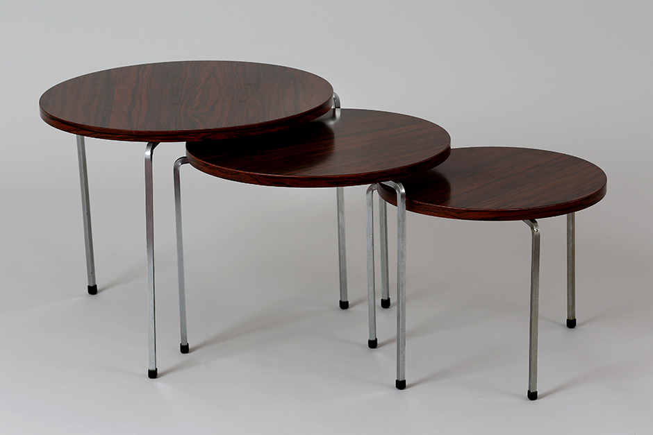 Set of three nesting tables, rosewood veneer top, metal tripod legs
