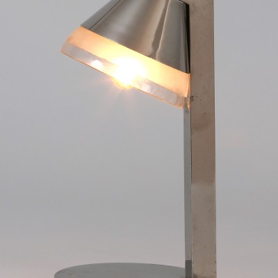 Lampe de bureau en métal nickelé à bras fixe vertical en poterne et cache-ampoule conique doublé d’origine d’un cône en verre dépoli. Socle rond à épaisse platine