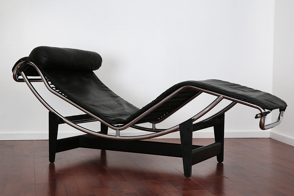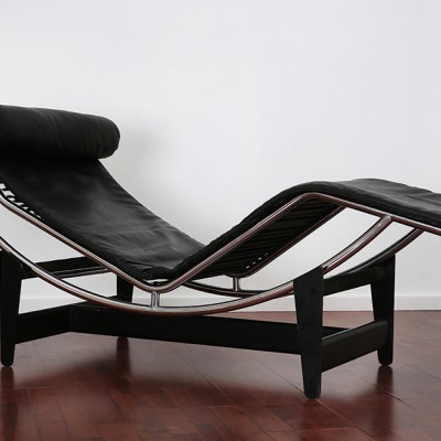 Chaise-longue modèle « LC4 », structure en métal tubulaire chromé, piètement en métal laqué noir, garniture de cuir noir Edition Cassina