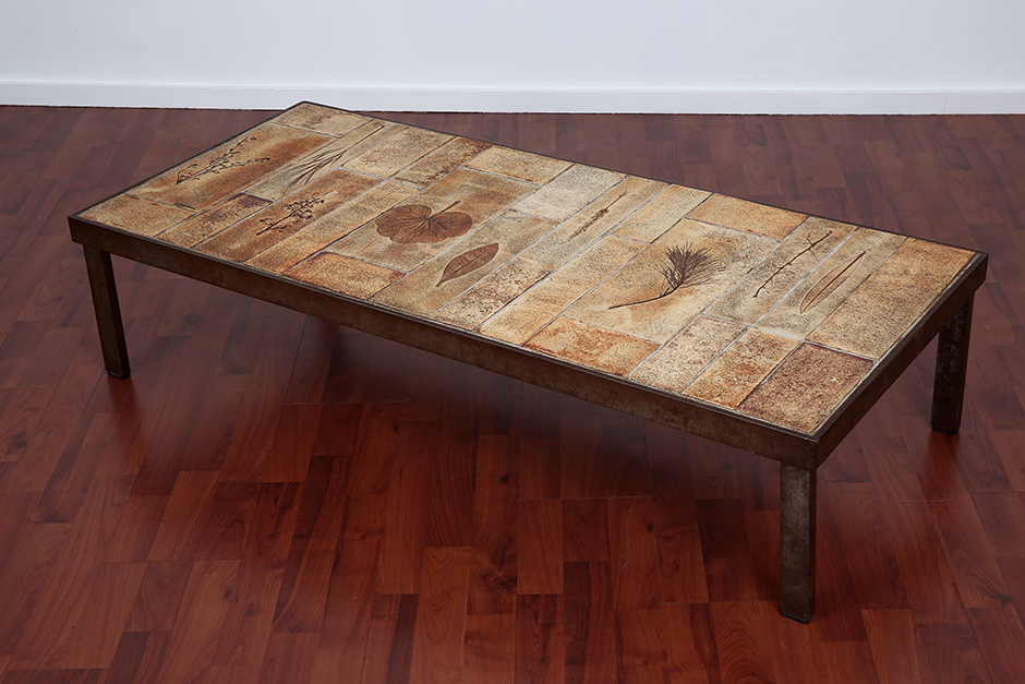 Table basse, plateau de forme rectangulaire composé de carreaux de céramique à décor de végétaux appliqués Signée